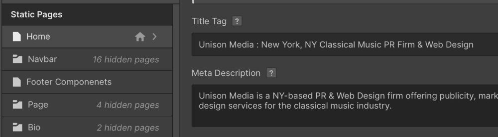 To add title tag and meta description to a static page, open page specific settings and enter the title tag and meta description there.